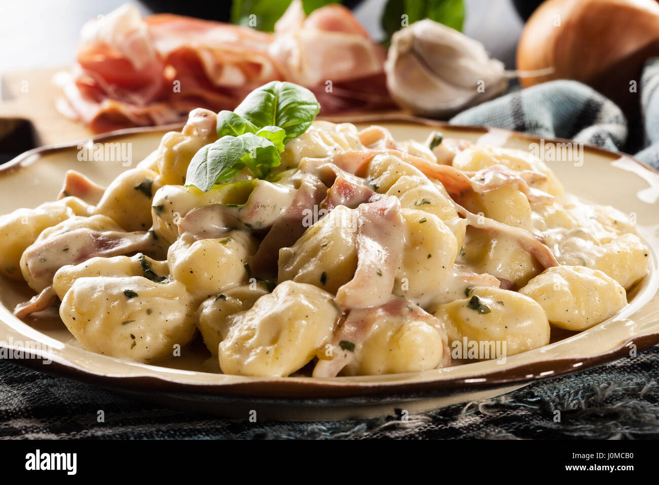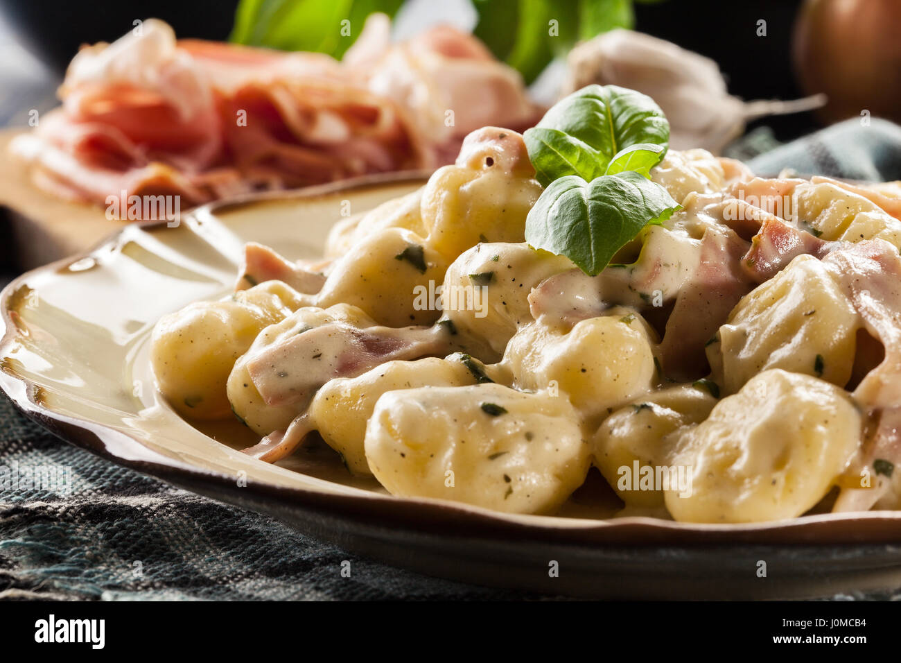 Potato gnocchi, Italian potato dumplings with cheese sauce, ham and basil on a plate Stock Photo