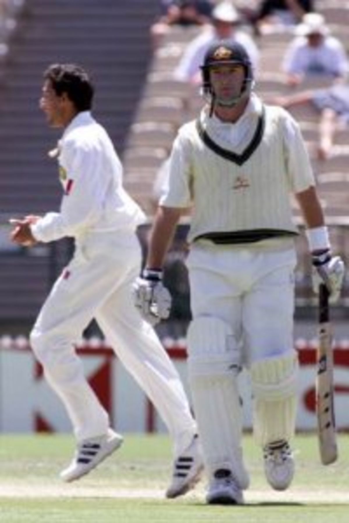 Mark Waugh of Australia walks from the ground out for eight caught by VVS Laxman of India off the bowling of Agit Agarkar • Dec 10, 2003 • Hamish Blair/Getty Images