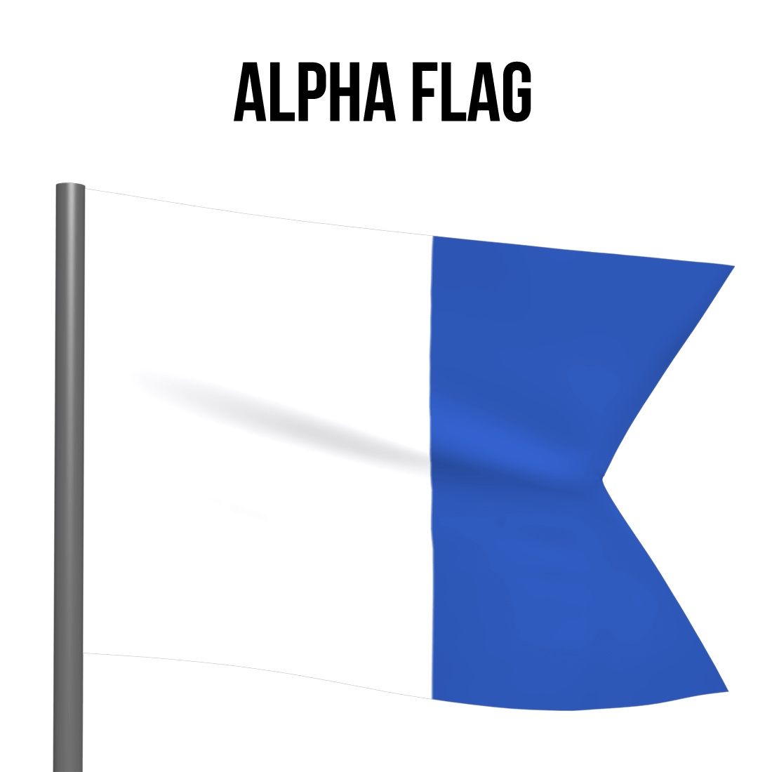 Two kinds of flags are utilized to indicate diving activity: 1. Alfa flag. A blue-and-white International Code Flag An (or Alfa flag), at least 3.3 feet (one meter) high and noticeable from all bearings, must be displayed on vessels on federally controlled waters.